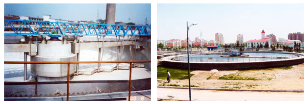 SZG型多用于輻流式沉淀池,即初次沉淀池的污泥排除和排除浮渣。本機(jī)為中心傳動(dòng),平臺(tái)固定支墩式,通常直徑范圍在8米至20米。小型下部采用整體對(duì)螺線刮板,中大型下部采用多板傾斜刮板,上捕浮渣收集裝置,池中心配水與排泥。
